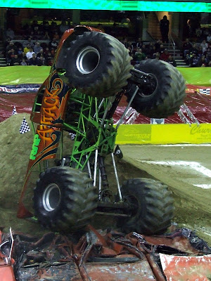 Rap Attack, known for spectacular wheelies, stood the truck straight up and down and began to walk the truck over the cars. However, Rappach got a bit tripped up and the truck took a soft roll onto the side of the FMX hill, suffering minor body damage. The judges were unimpressed, giving Rappach an extremely low 15.